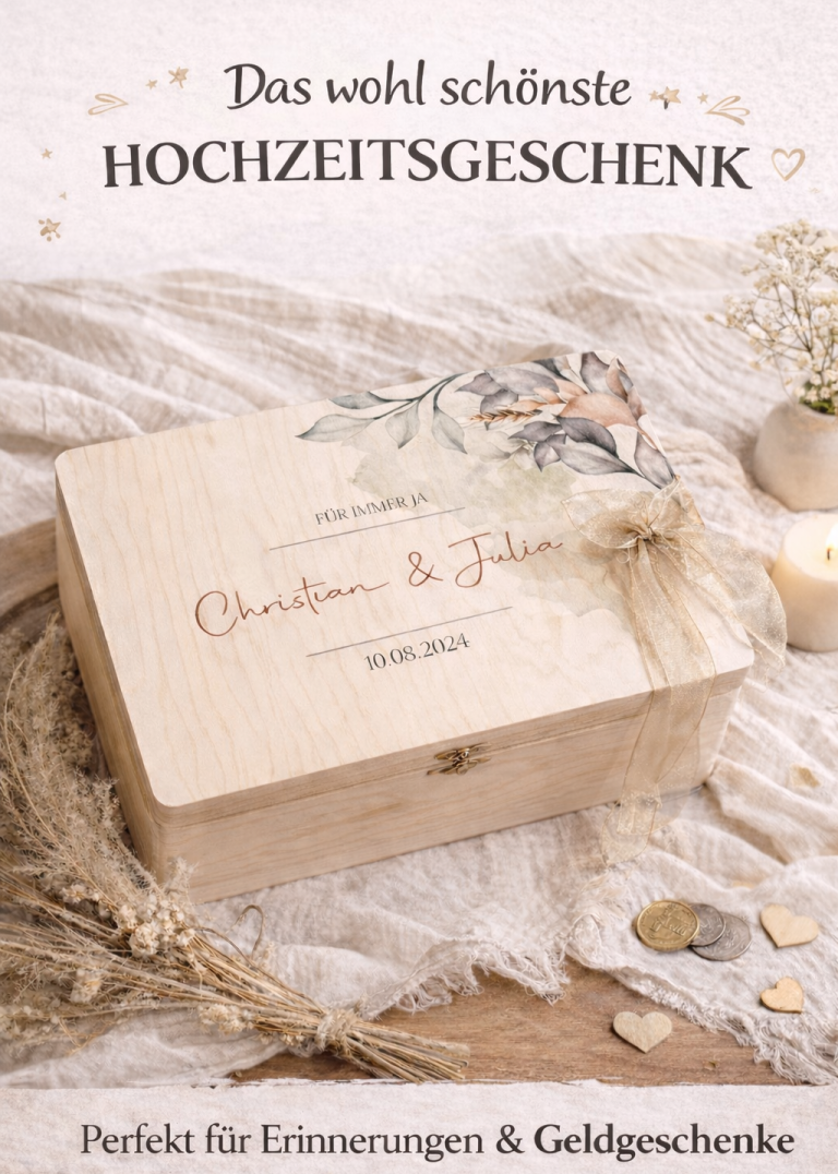 Mit Namen und Datum graviert wird sie zu einem einzigartigen Geschenk für das Brautpaar – perfekt, um Geldgeschenke, Karten oder gemeinsame Erinnerungen stilvoll aufzubewahren.