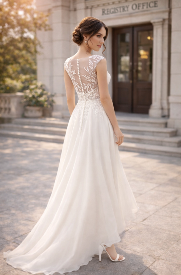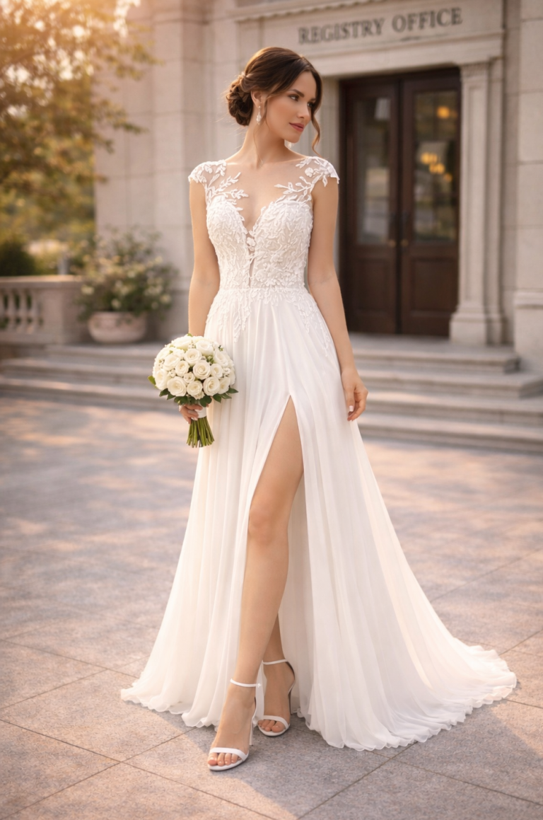 Dieses schlichte Brautkleid für das Standesamt eignet sich perfekt für Bräute, die einen romantischen, aber gleichzeitig modernen Hochzeitslook suchen.