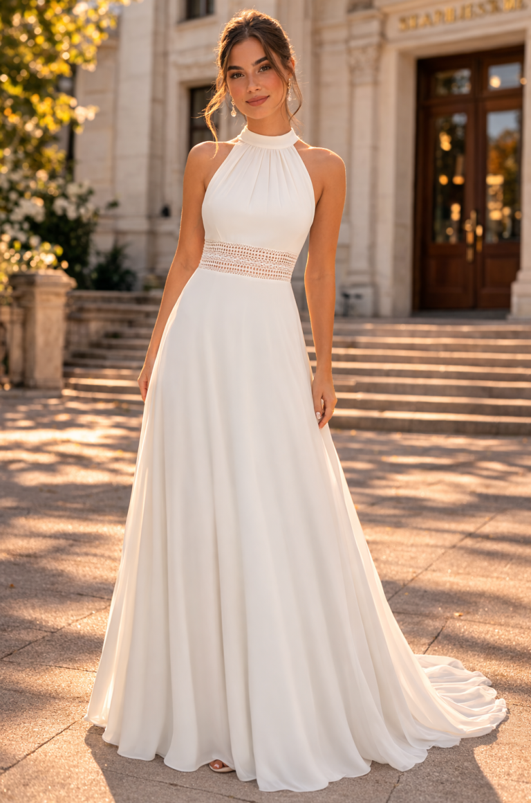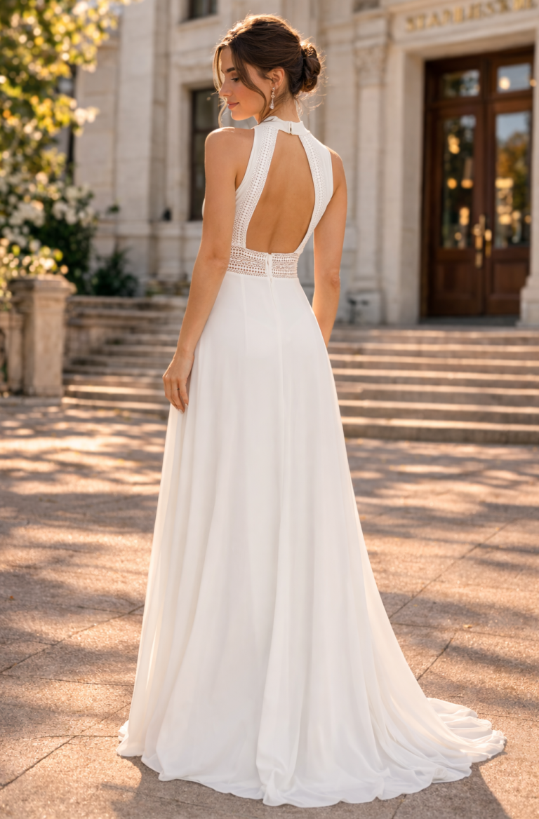 Elegantes Brautkleid für das Standesamt mit modernem Halterneck-Design und fließendem Rock. Das minimalistische Hochzeitskleid überzeugt durch eine feminine Silhouette und einen stilvollen offenen Rücken.