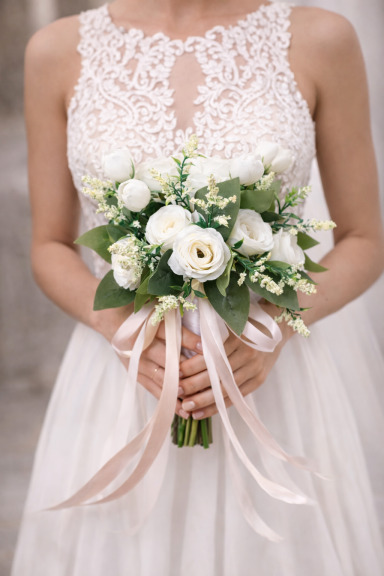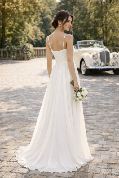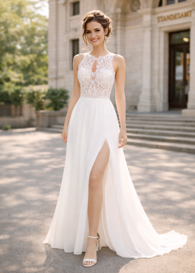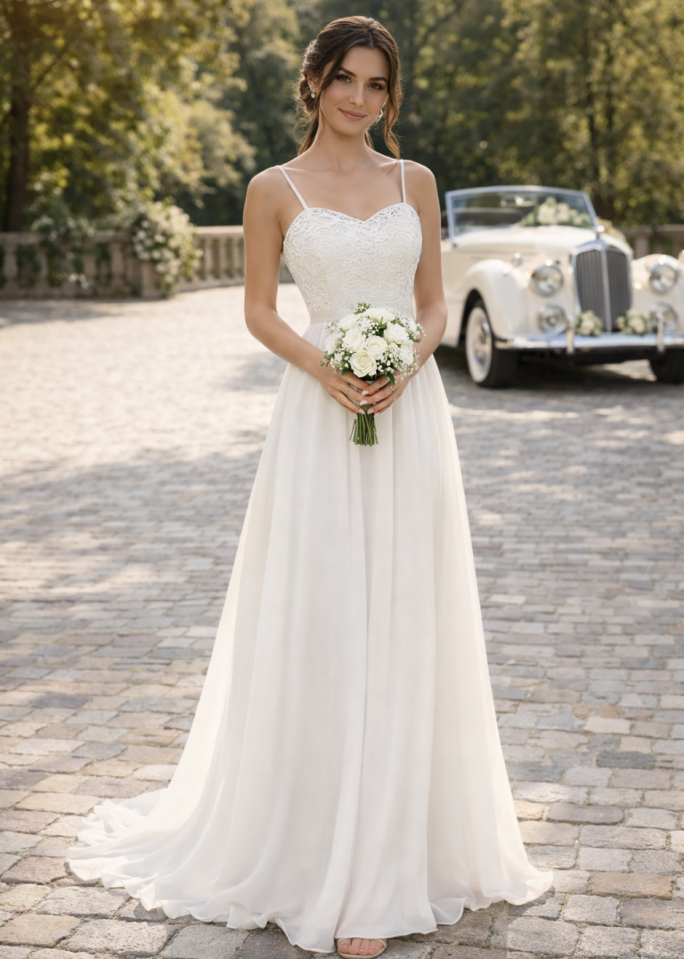 Besonders für eine Sommerhochzeit oder Frühlingshochzeit ist dieses leichte Brautkleid ideal. Der fließende Stoff wirkt elegant und sorgt gleichzeitig für angenehmen Tragekomfort an warmen Tagen. Kombiniert mit dezenten Brautschuhen und einem schlichten Brautstrauß entsteht ein stilvolles Hochzeitsoutfit für moderne Bräute.