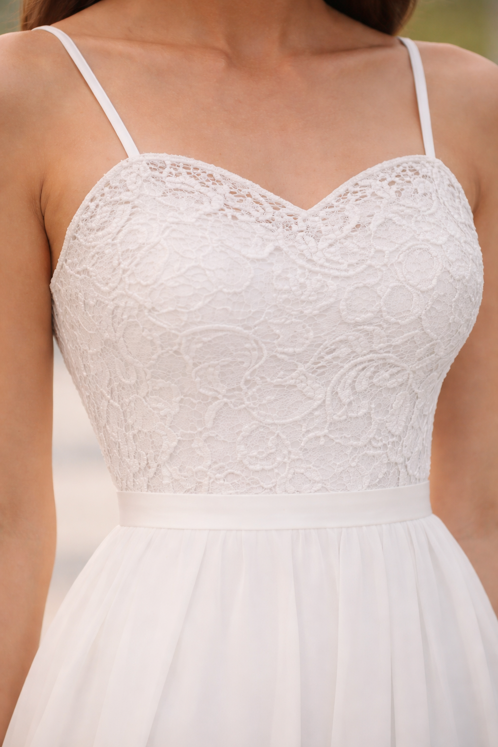 Elegantes Brautkleid mit Spitze und Chiffon – Zeitlose A-Linie für moderne Hochzeiten. Die schmeichelnde A-Linie mit betonter Taille unterstreicht die Figur und lässt den weich fallenden Rock sanft bis zum Boden fließen.