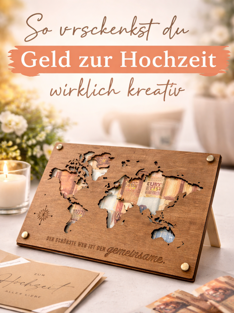 Die stilvolle Weltkarte kombiniert Geldgeschenk und Erinnerung in einem – ideal für Paare, die von gemeinsamen Reisen träumen. So wird dein Geschenk persönlich, modern und unvergesslich ✨